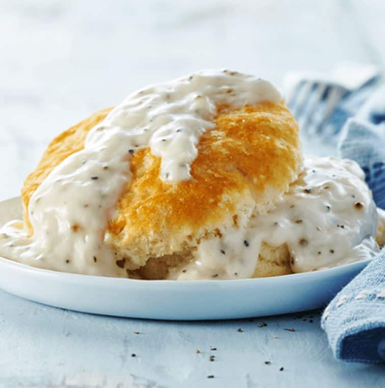 Hot breakfast sausage gravy served over a hot, fresh biscuit.