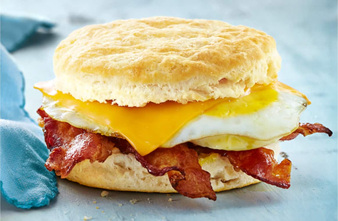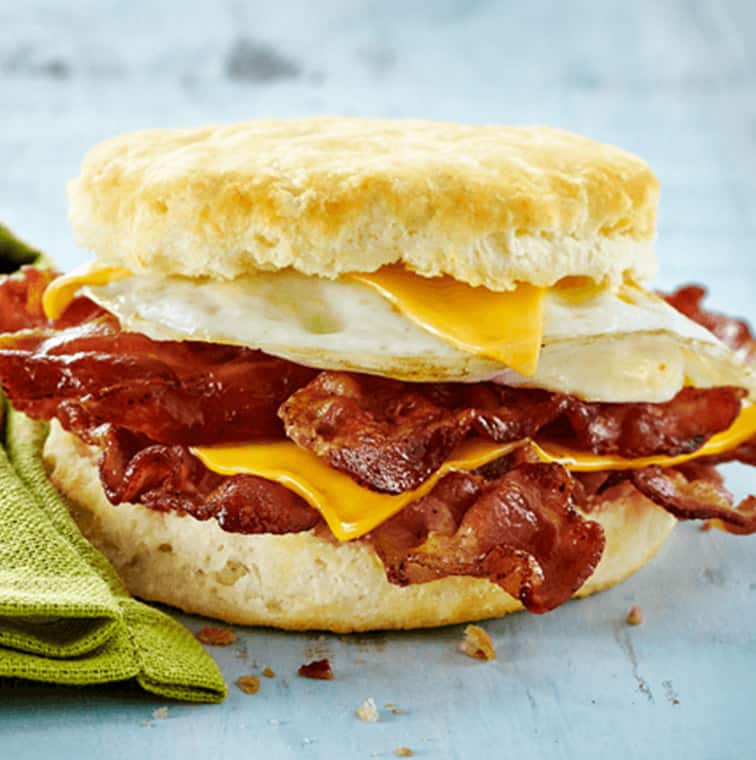 4 strips of griddle-cooked bacon, a locally sourced fried egg, and 2 pieces of melted American cheese served on a hot, fresh biscuit.